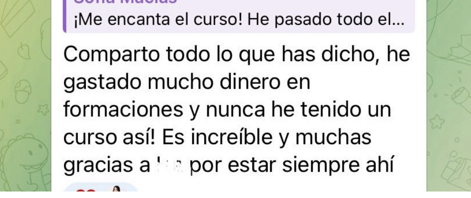 Cuando compras el curso, obtienes acceso instantáneo a nuestra comunidad. Allí puedes hacer preguntas y conectarte con otras personas. Realizamos tres llamadas sobre la mentalidad por semana y una llamada semanal donde puedes hacer tus preguntas y recibir mentoría para desarrollar tus habilidades.